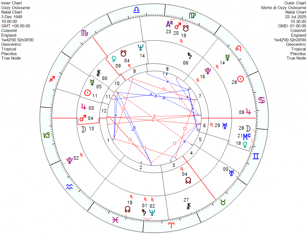 Tutti questi transiti, in dialogo stretto con i punti nevralgici della carta natale di Ozzy Osbourne, mostrano una sincronicità densa e coerente: Urano che torna nel suo segno, la Luna che corre di nuovo a vuoto in Gemelli, Giove che tramonta dove un tempo sorgeva, Marte e il Nodo che riattivano la casa della morte. È come se il cielo, nel suo linguaggio archetipico, avesse lentamente e inesorabilmente orchestrato il momento del rilascio, restituendo alla coscienza incarnata la libertà di uscire dal corpo, dopo un lungo e faticoso cammino di disgregazione fisica.